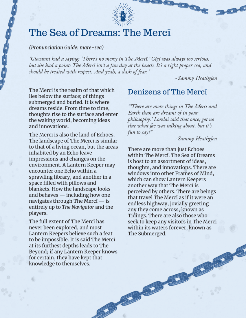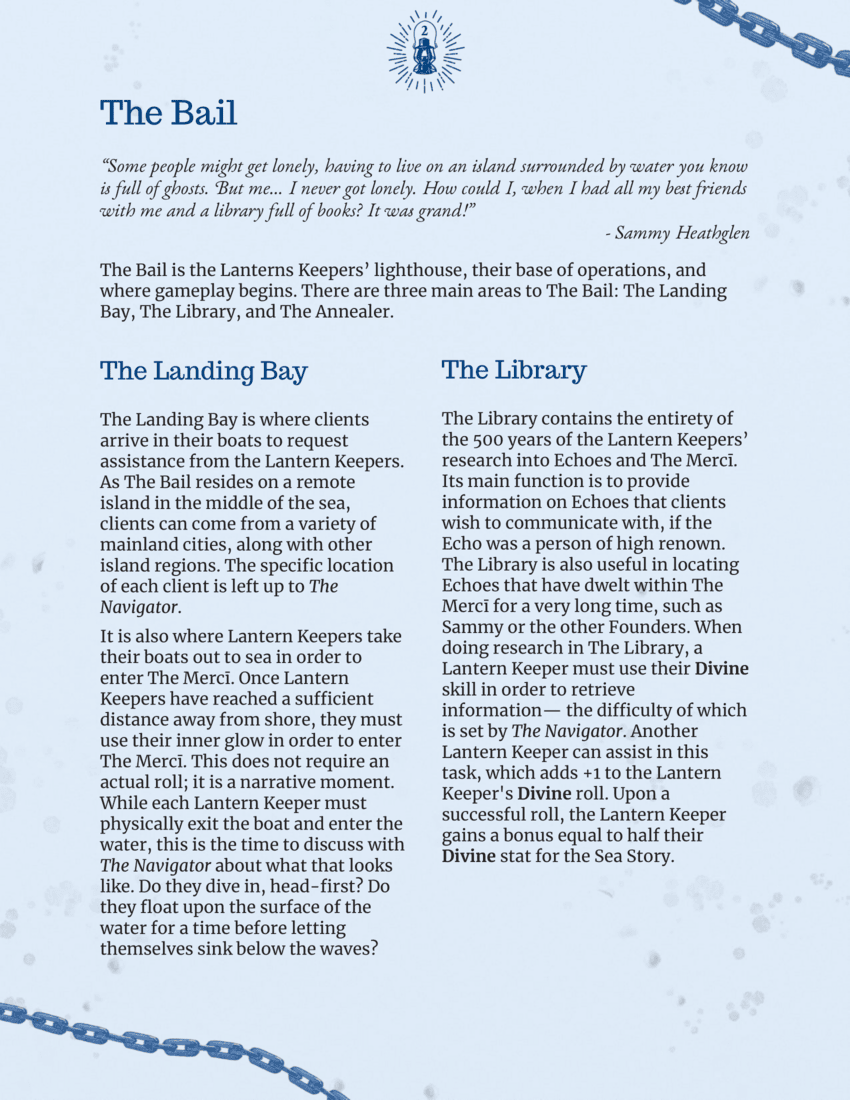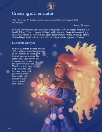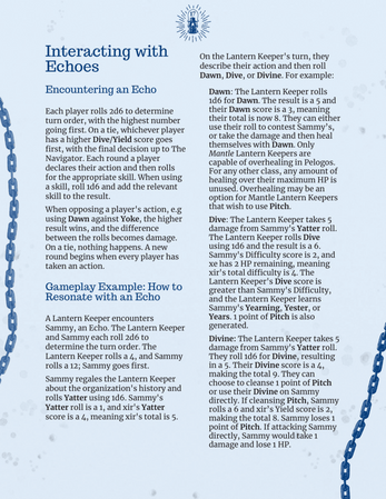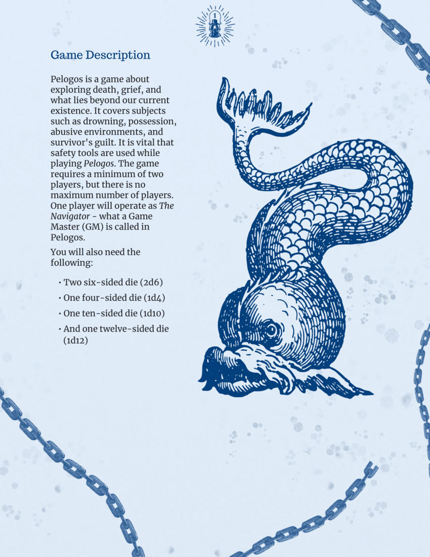 Pelogos is a game about exploring death, grief, and what lies beyond our current existence. The game covers subjects such as drowning, possession, abusive environments, and survivor's guilt. The game requires a minimum of two players, with one player operating as the Game Master (GM), known as The Navigator in Pelogos, but there is no maximum number of players.